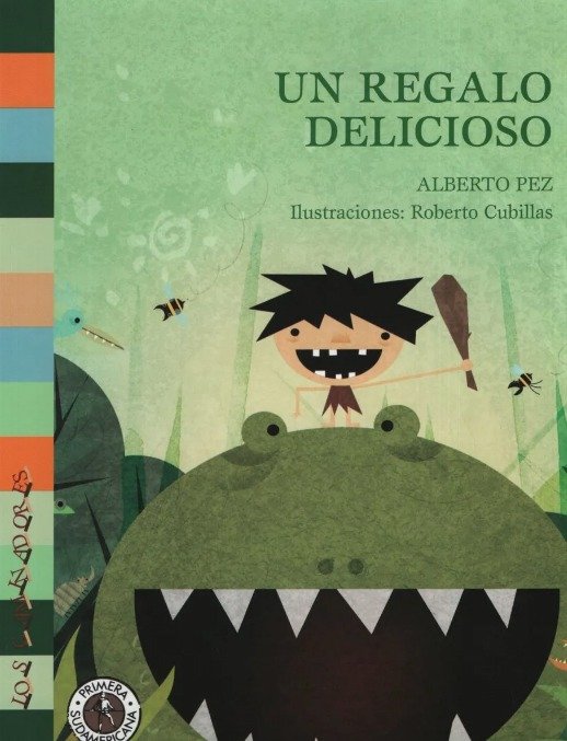 Guguk sonríe al pensar en la sorpresa que le va a dar a su abuela cuando vea el regalo apetitoso que le lleva: un dinosaurio re-gordo, re-grande, recontra-enorme. ¡Mmm! Se le hace agua la boca. ¿Cómo van a prepararlo? ¿Asado? ¿Al horno? ¿Cocido en la cacerola?